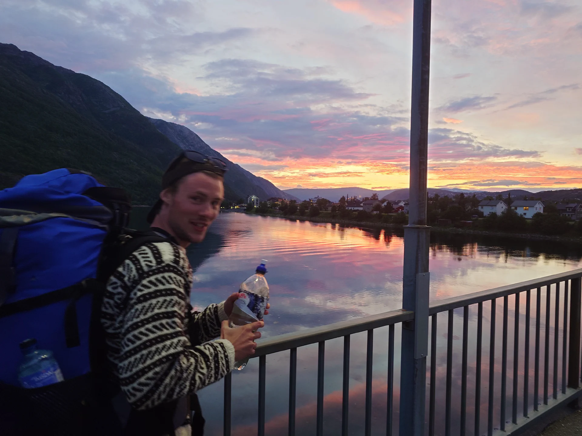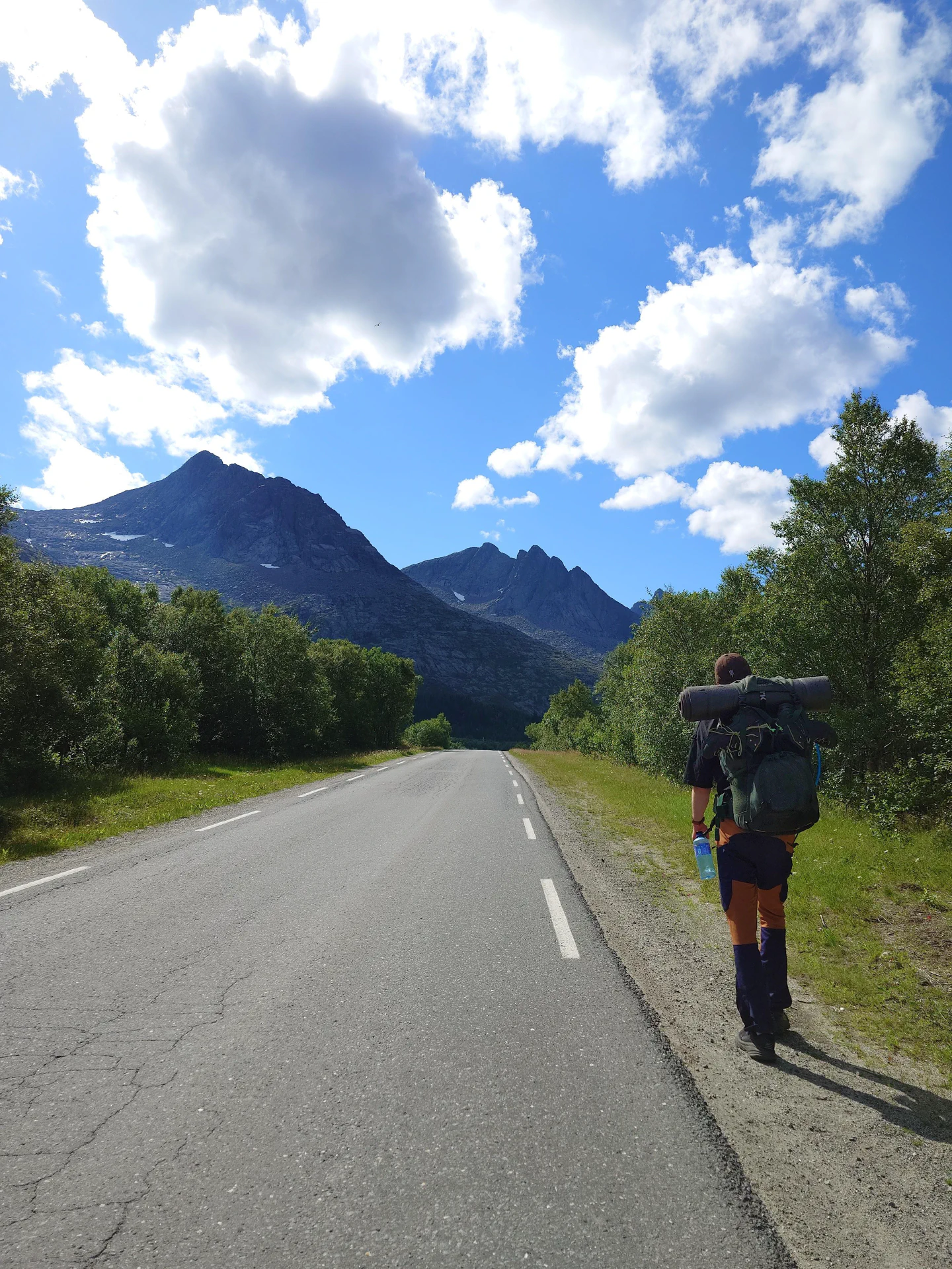Vi endte opp med å gå tilbake til byen for å busse til Mosjøen. Det tok ganske mange timer, og var ei passe utfordring med 30kg ryggsekker og begrenset med vann. Heldigvis møtte vi på et lokalt langhus på veien, hvor de tilbød oss god niste og drikke.